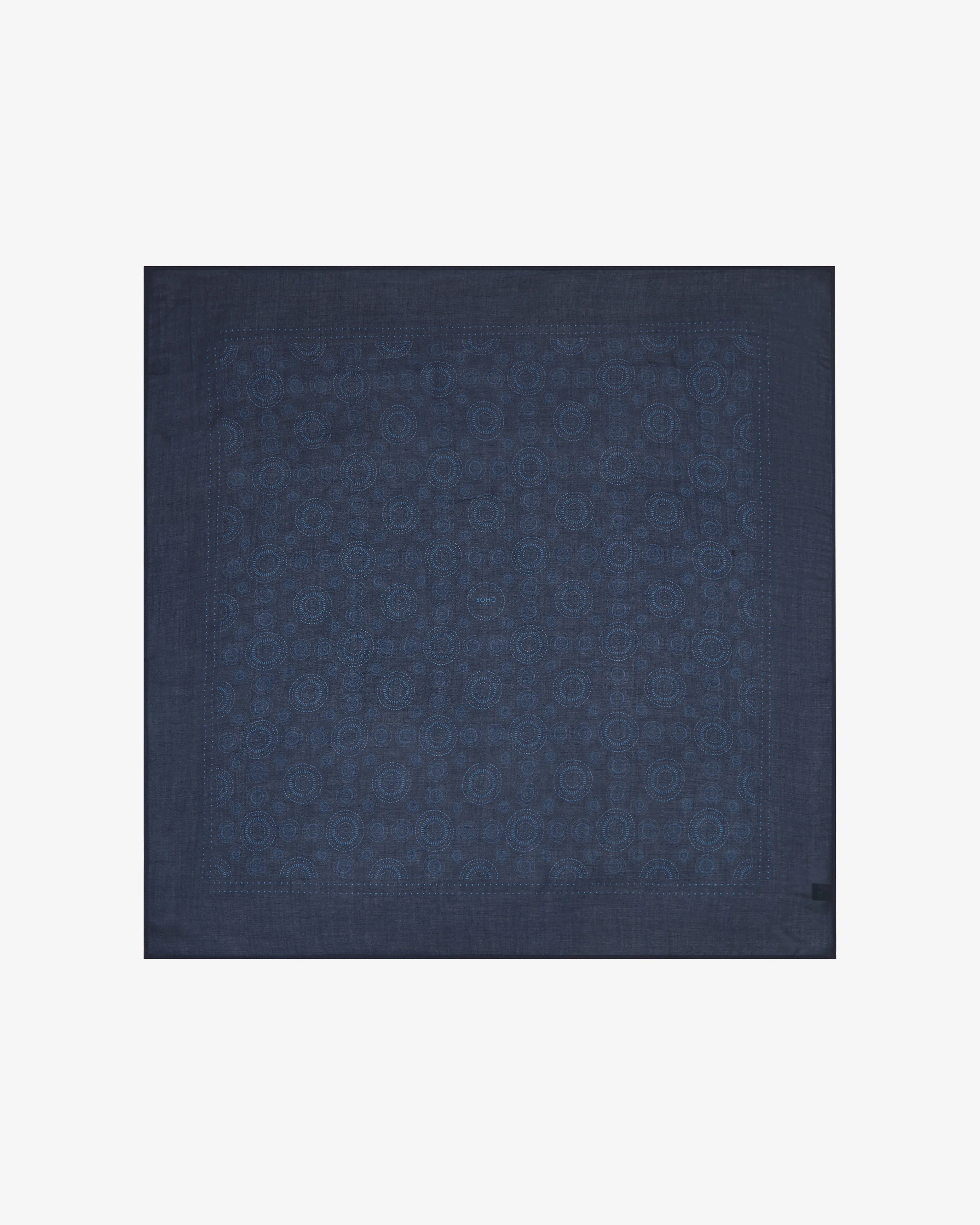 The 'Circles in Blue' bandana in navy blue features disc motifs constructed from tiny light blue dots, each containing multiple concentric rings. Each disc is slightly offset and surrounded by smaller, matching versions. The pattern’s layout and consistent scaling evoke the structured geometry of Op art.