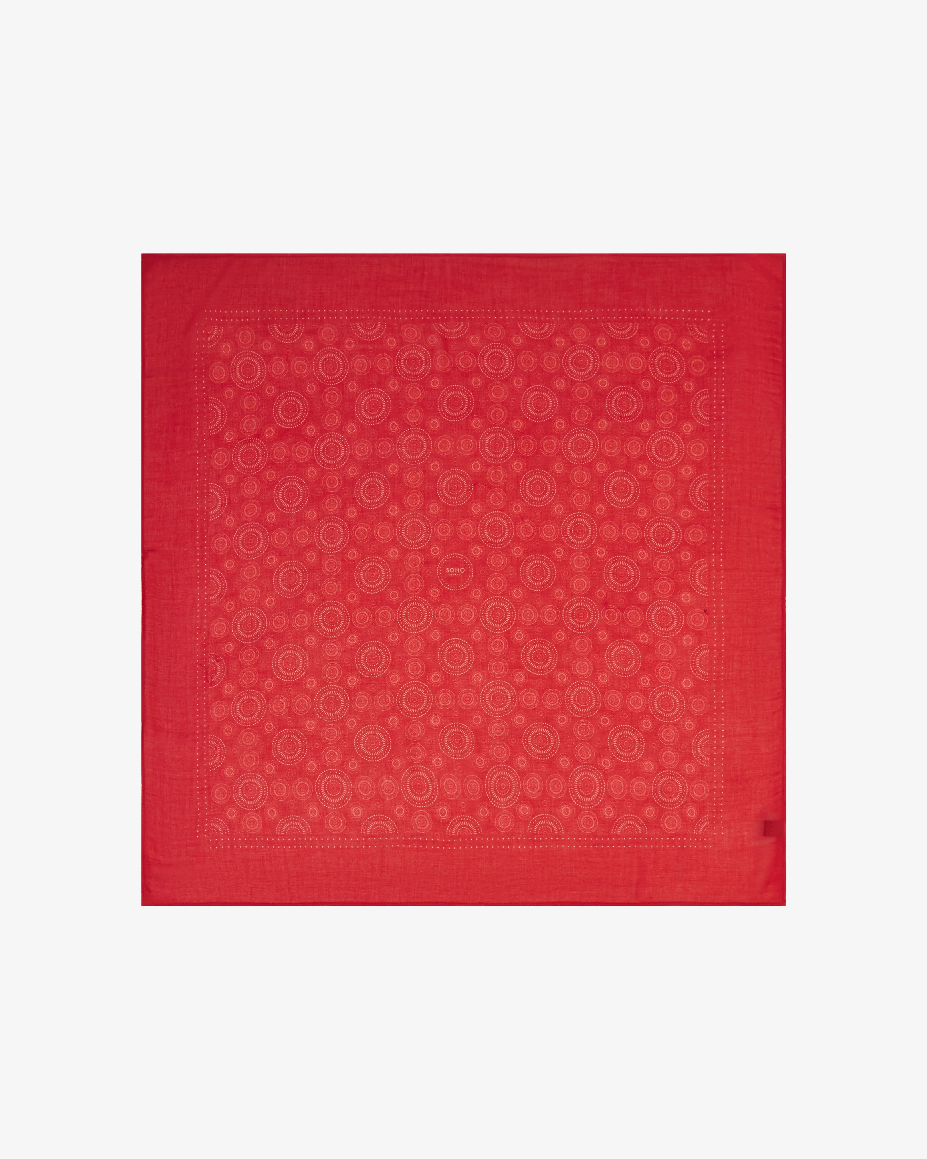 The 'Circles in Red' bandana in bright red features disc motifs constructed from tiny white dots, each containing multiple concentric rings. Each disc is slightly offset and surrounded by smaller, matching versions. The pattern’s layout and consistent scaling evoke the structured geometry of Op art.