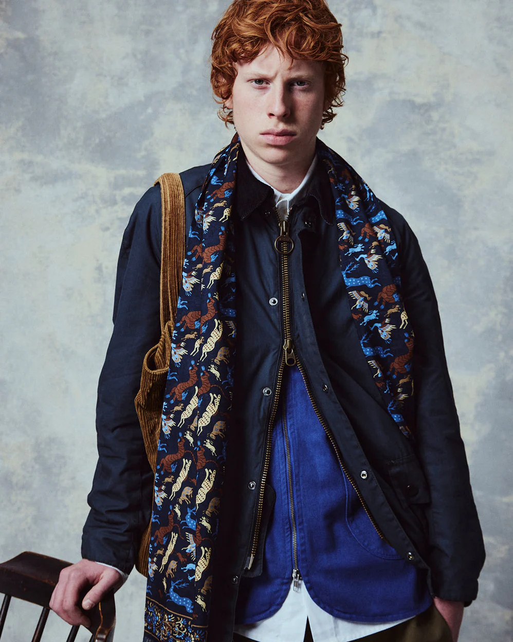 Our Airforce Blue 'Woodland Creatures' silk-wool scarf for men belongs to our premium UK collection. Designed and printed in Macclesfield, England, our scarves draw on the exceptional talent of local silk dyers and printers.