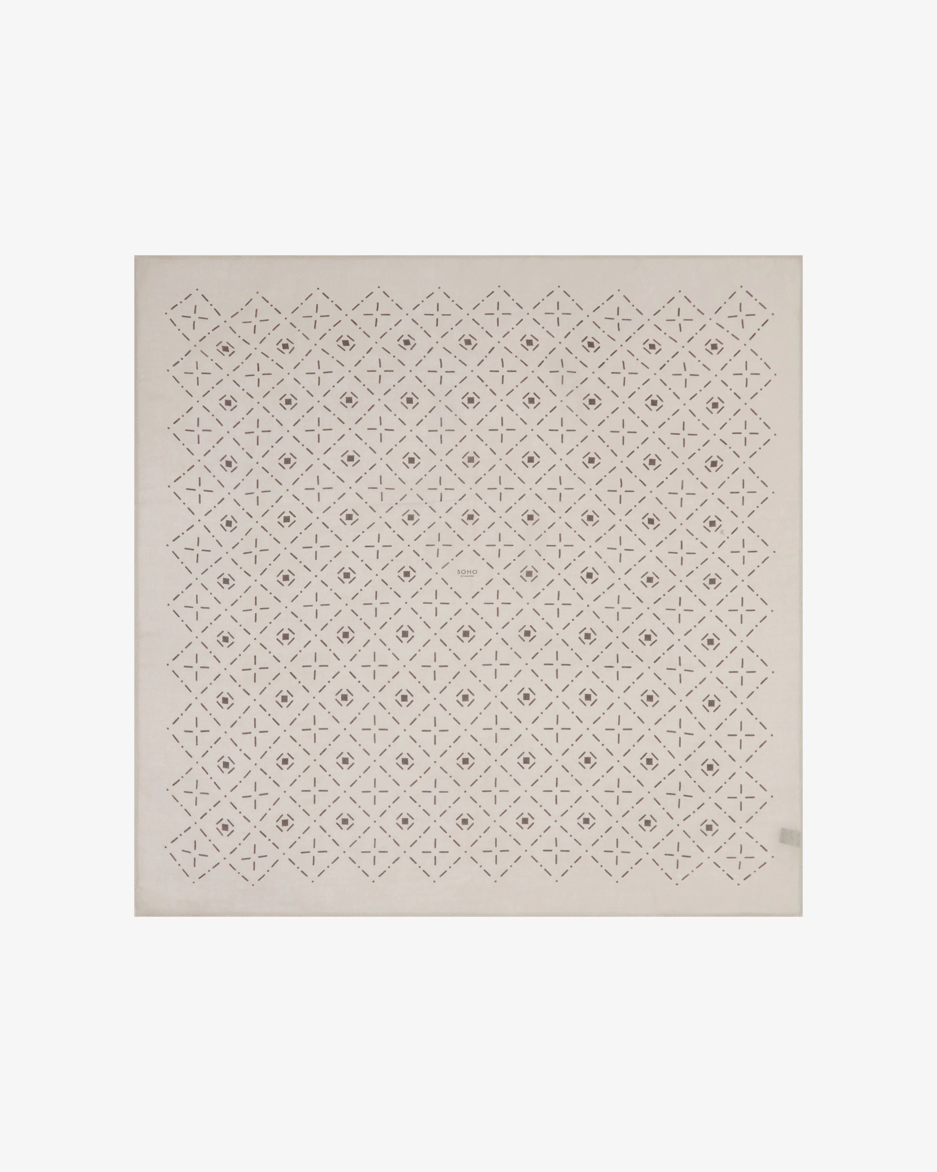 The 'Diamonds in Cream' bandana features a pale cream base with alternating lozenges and crosshair motifs in dark grey. Each sits within a diamond frame made from matching grey dots and dashes.