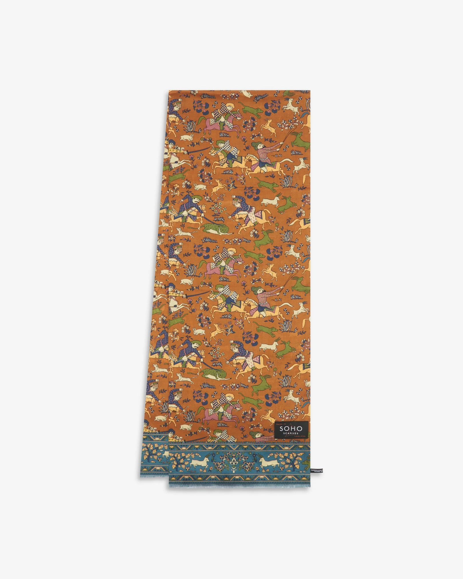 The meticulous production process of the âHuntersâ scarf achieves an immaculately detailed multicoloured design on a dull gold ground, combining ancient East Asian hunting motifs with matching floral border decoration.