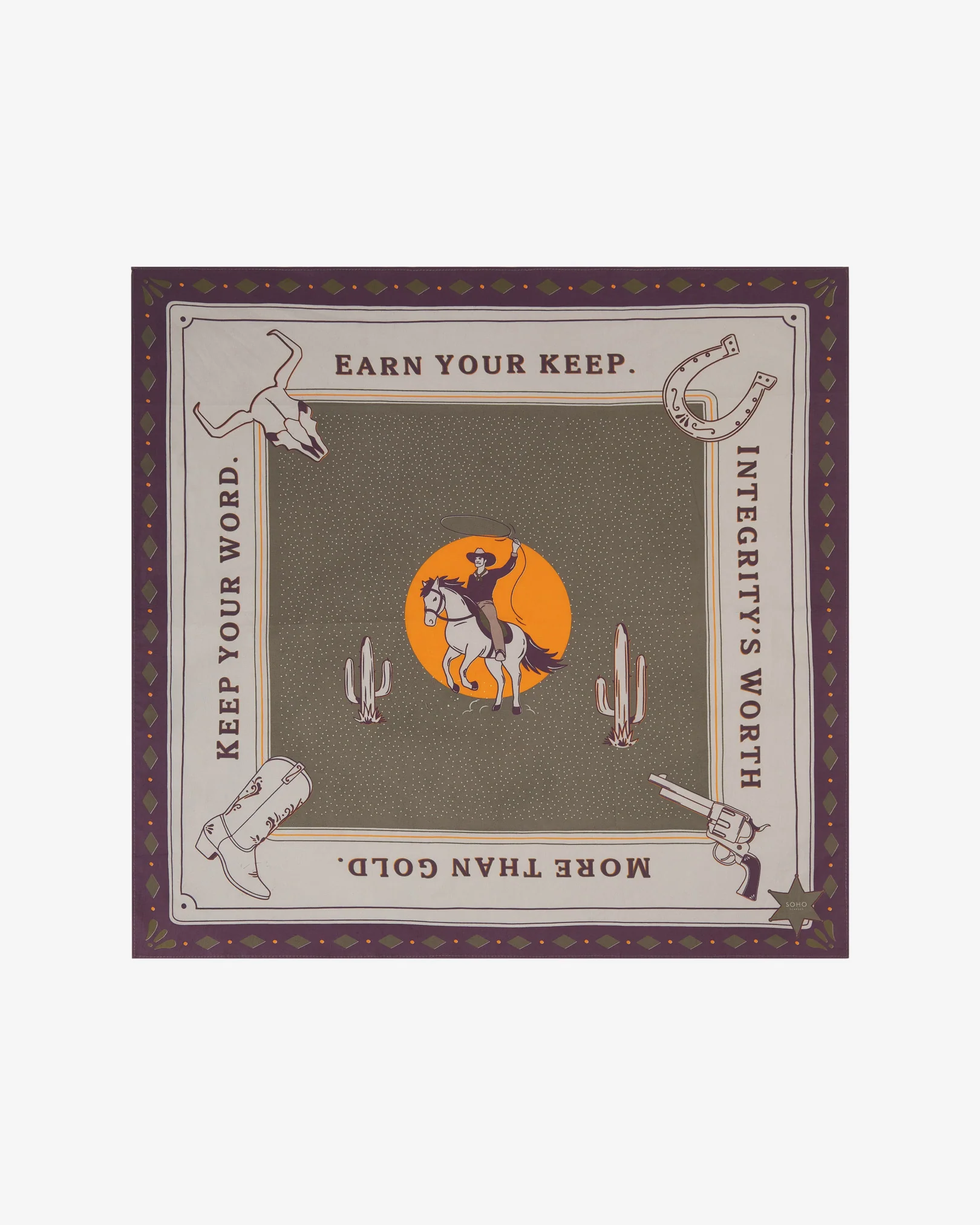 The focal point of the 'Integrity' khaki bandana features a cowboy lassoing on horseback, and is framed by an array of Wild West symbolism and frontier phraseology.