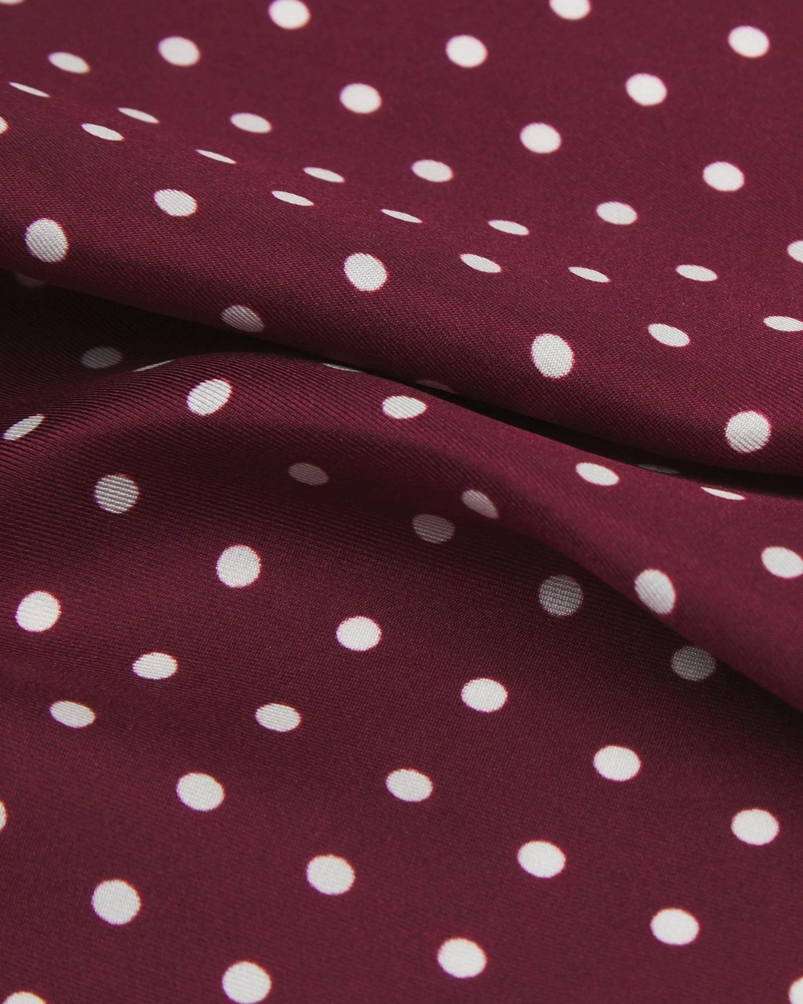 This classic white spotted pattern on a burgundy background works for all occasions and will add a luxurious finishing touch to your outfit. This timeless pattern is the perfect addition to your ensemble if you are looking to elevate your look.